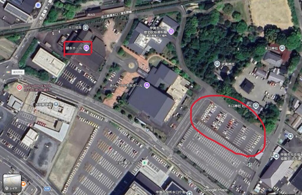 会場の東側、水口神社のそばに100台ほど停められる無料駐車場のほか、有料駐車場や甲賀市役所の駐車場も近くにございます。