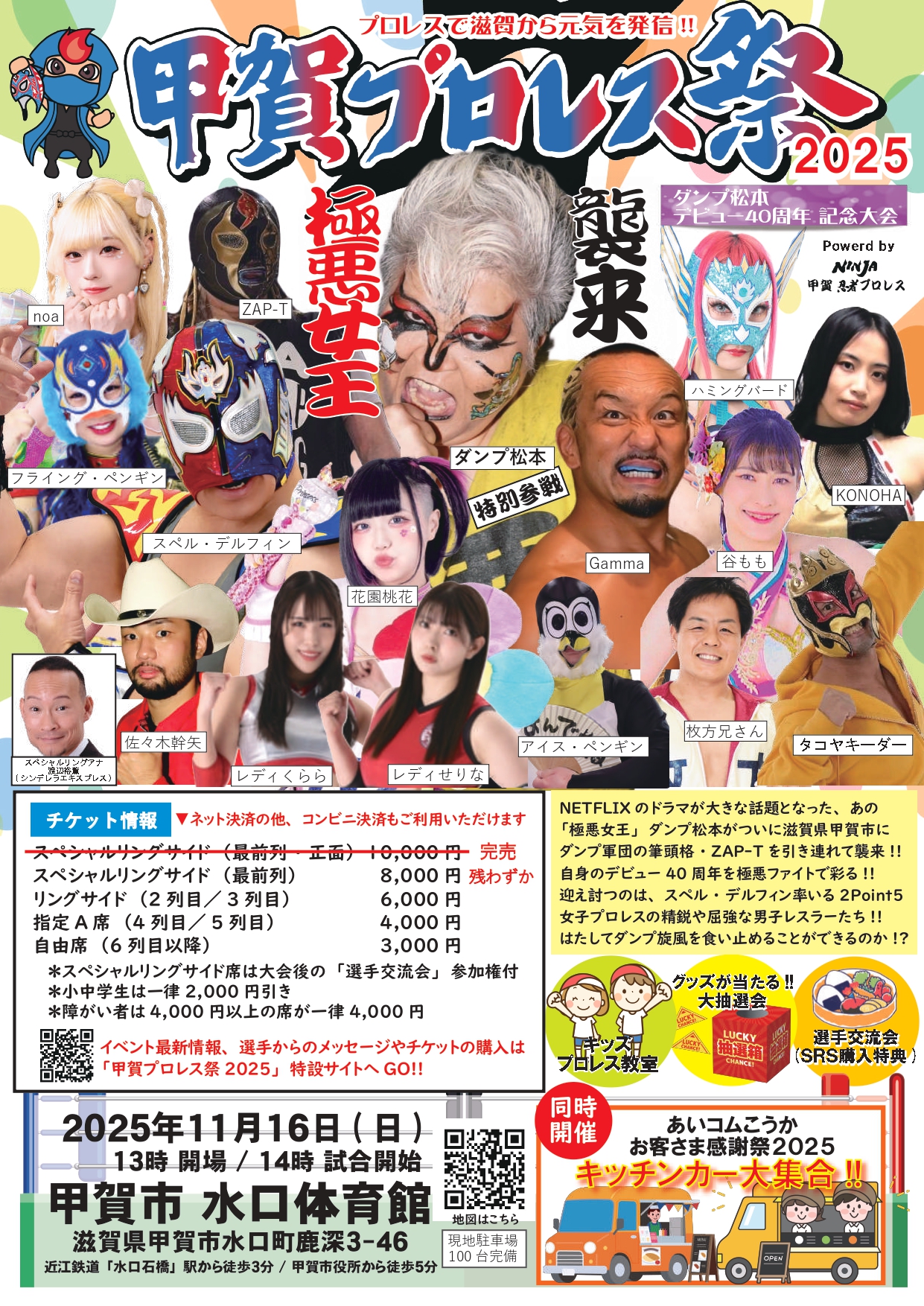 観戦チケットは「チケットペイ」、「楽天チケット」、甲賀プロレス祭2025窓口にて発売します。