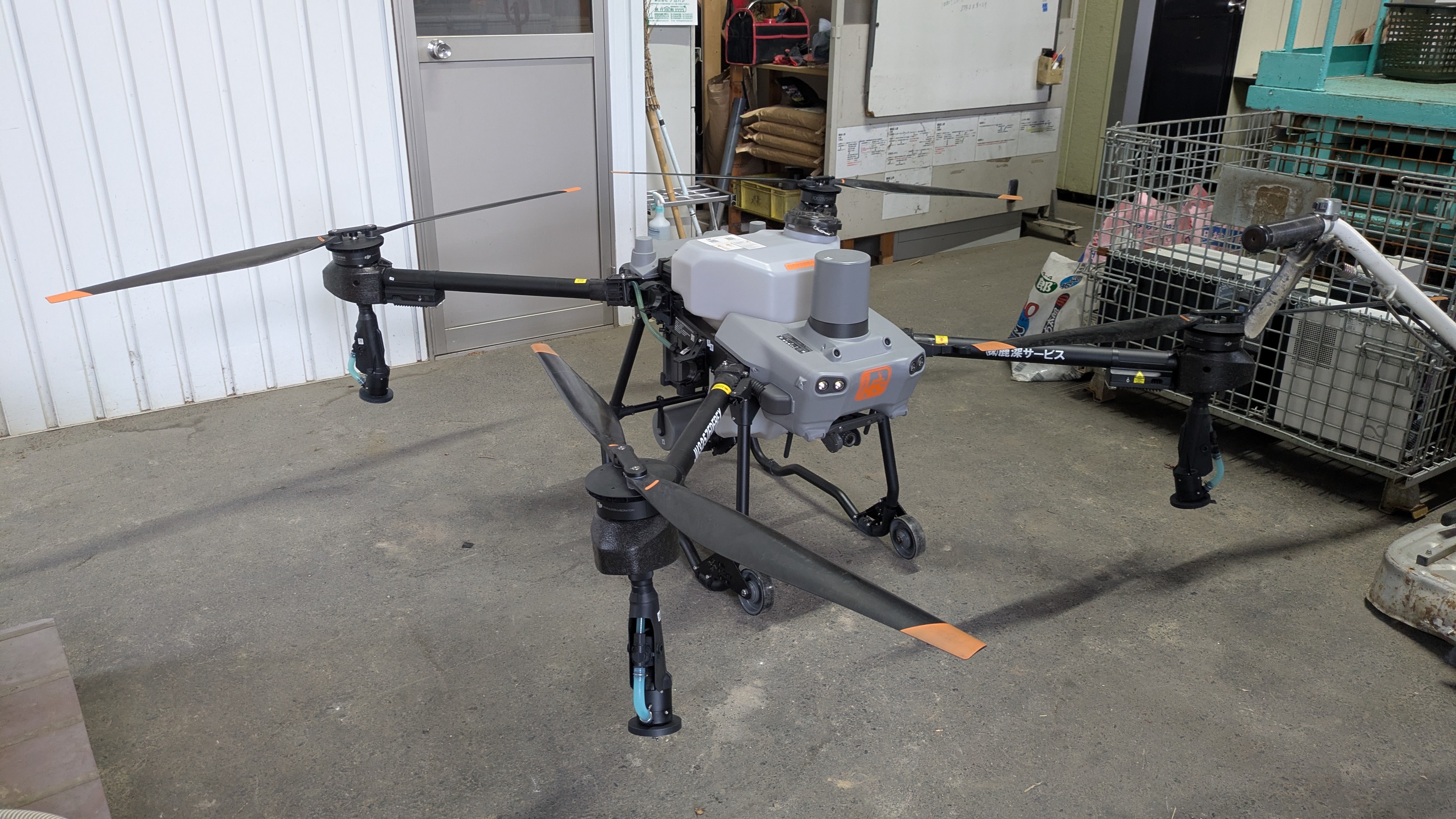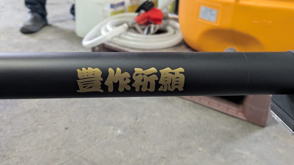 鹿深サービスの農薬散布専用ドローン。きっちりご祈祷も済ませているのがニクい。